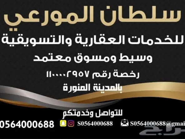 سر سلطان المورعي للعقار ان يقدم لكم الخدمات العقارية والتسويقية بيع وشراء و ايجار وإدارة أملاك وتسويق العقارات أراضي – شقق تمليك -عمائر – استراحات – إسكان عزاب – مواقع استثمارية – عقود ايجار معتمدة – كل الخدمات العقارية بين يديك امتلك عقارك بمجرد قرارك للتواصل وخدمتكم ما عليك إرسال العرض او الطلب عبر الواتساب0564000688
