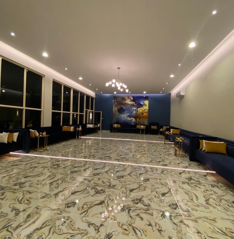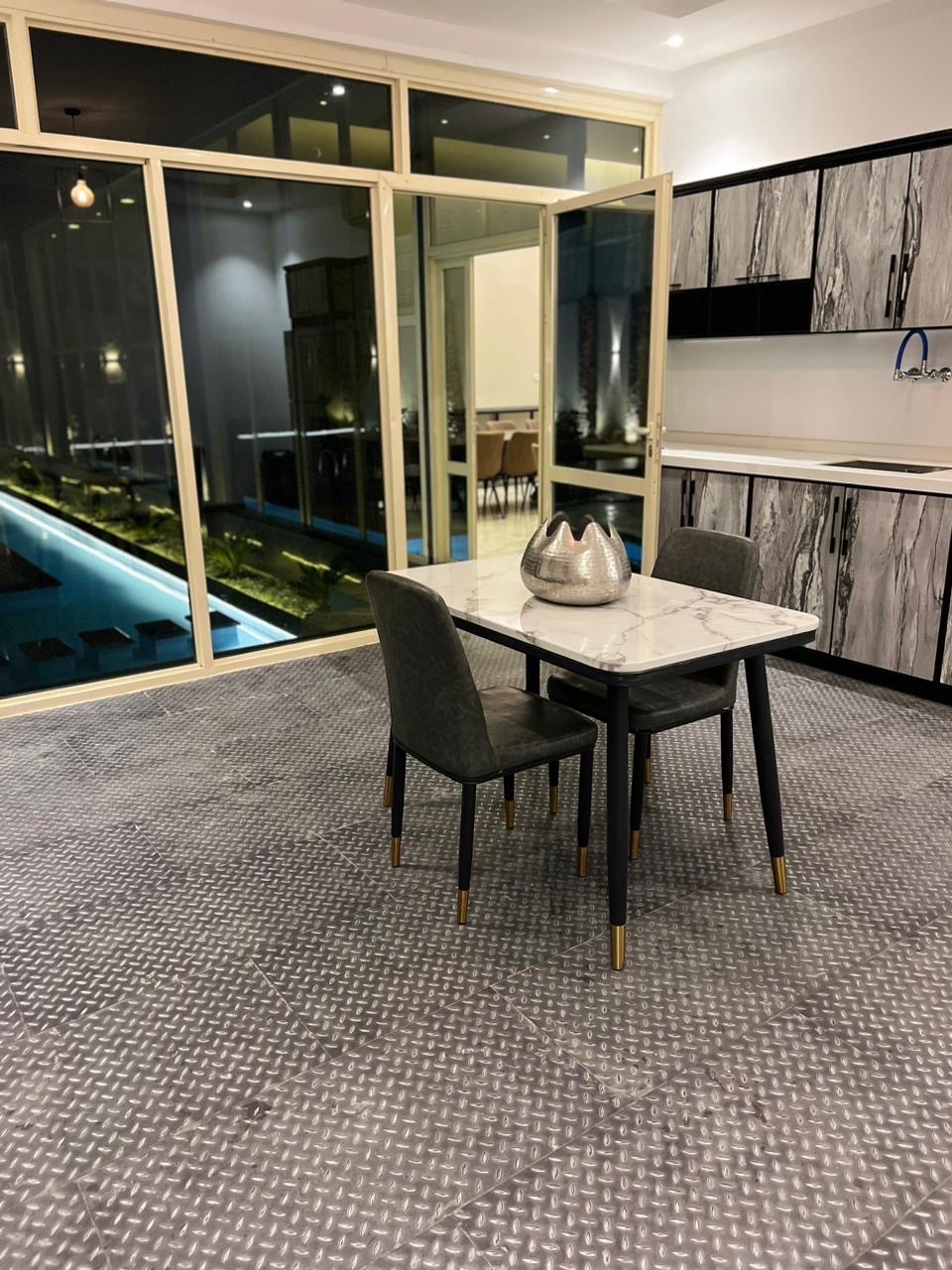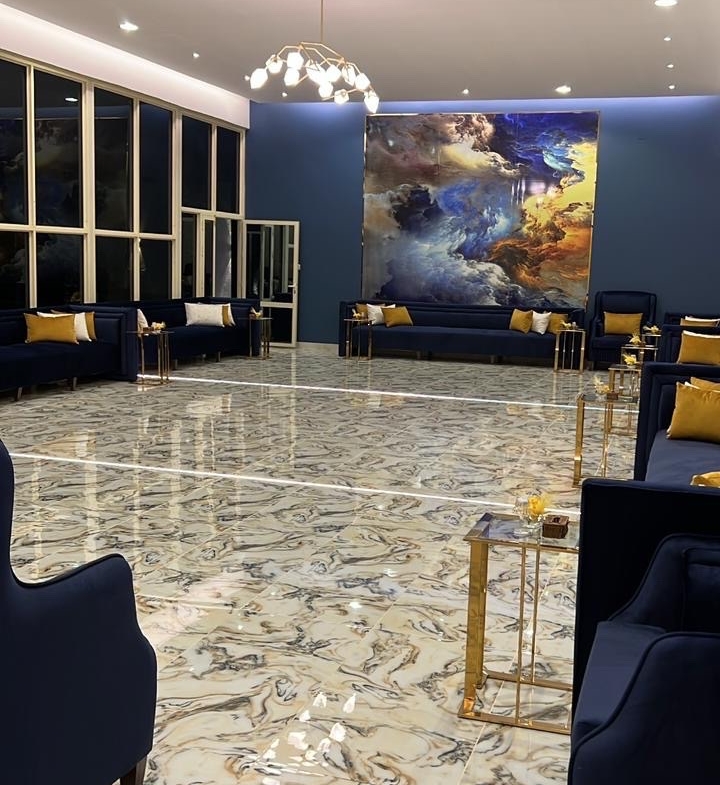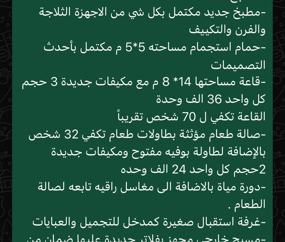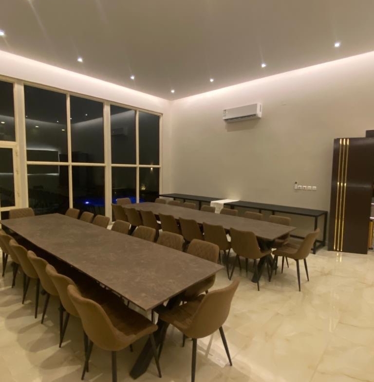 -صالة طعام مؤثثة بطاولات طعام تكفي 32 شخص بالإضافة لطاولة بوفيه مفتوح ومكيفات جديدة 2حجم كل واحد 24 الف وحده