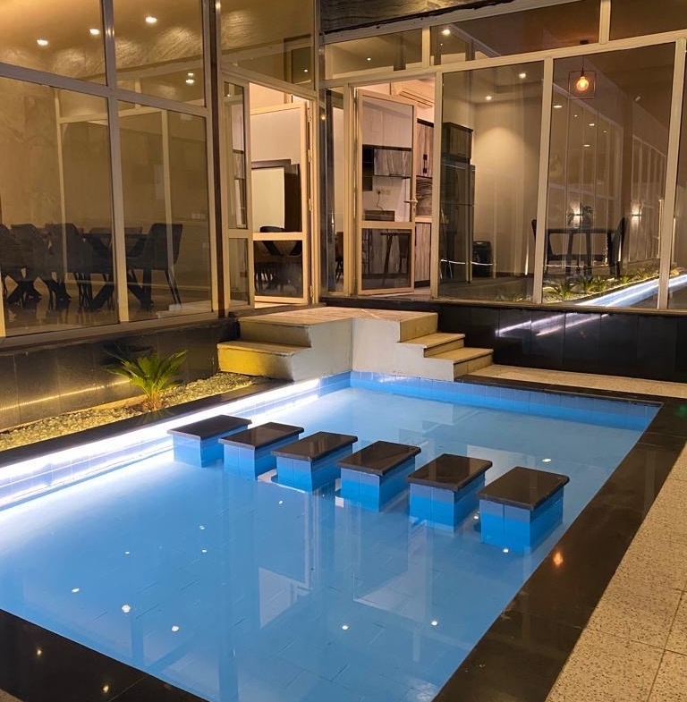 -مكونه من غرفة نوم مساحتها 9* 7 مؤثثه بالكامل مع وجود مكيفين بالاضافة الى جلسة مطله على المسبح