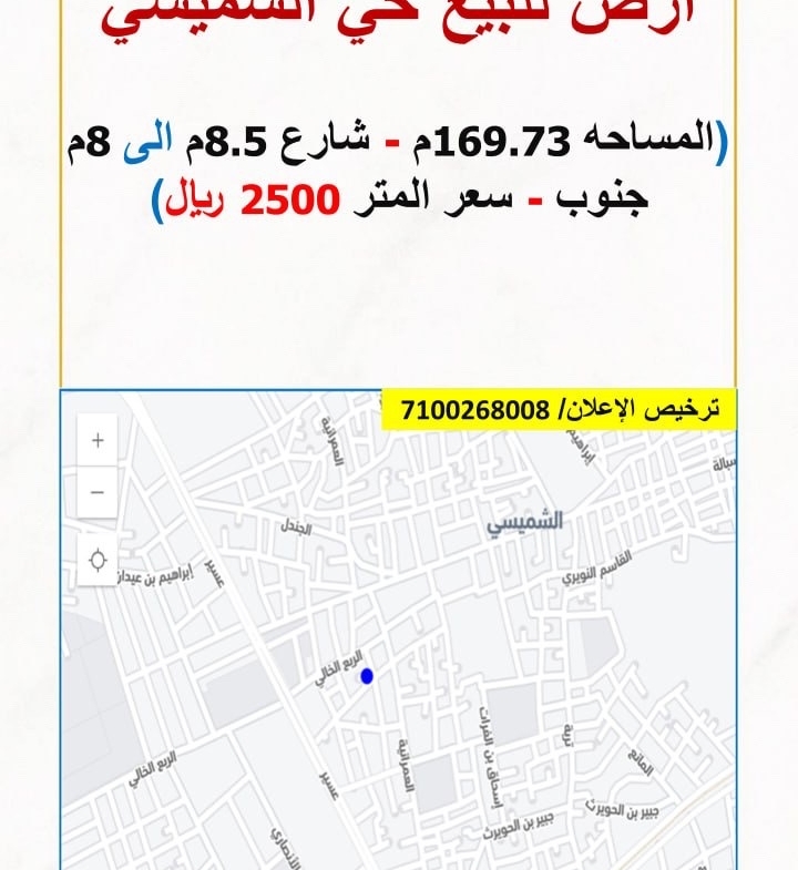 (المساحه 169.73م – شارع 8.5م الى 8م جنوب – حد البيع 2500 ريال للمتر)