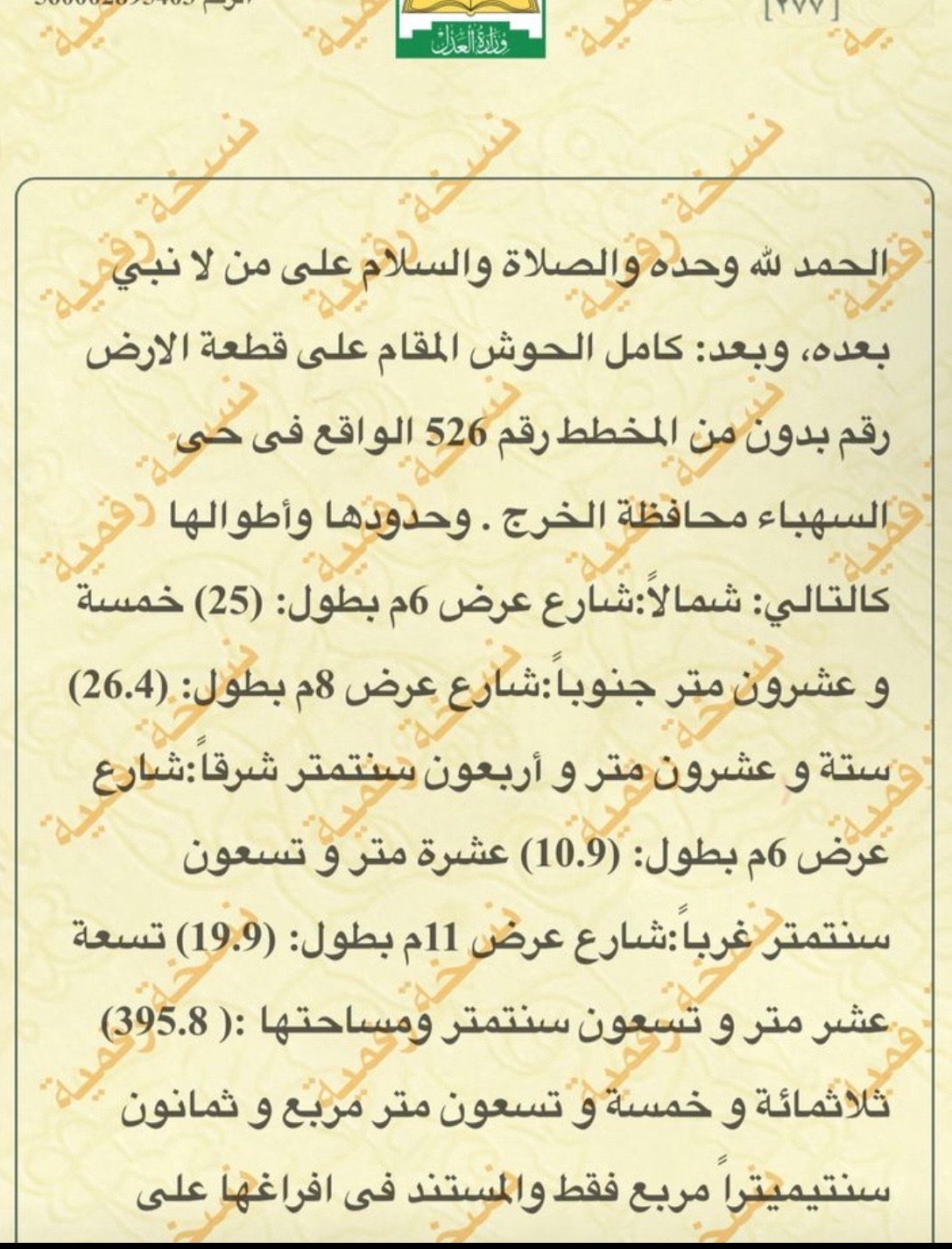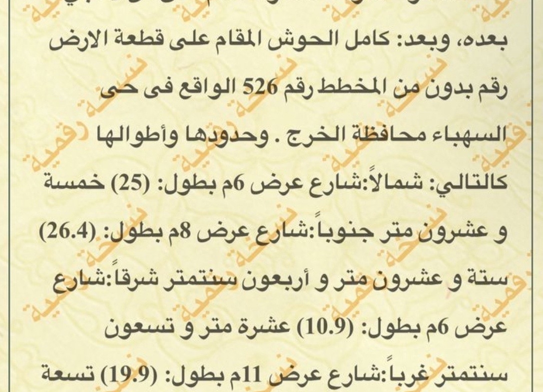 وصف موقع العقار: | كامل الحوش المقام على قطعة الارض رقم بدون من المخطط رقم 526 الواقع فى حى السهباء محافظة الخرج . |