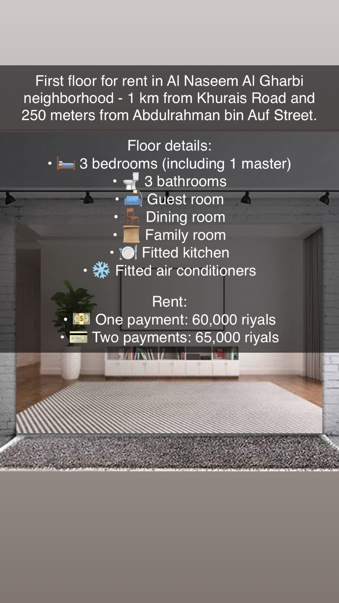 للإيجار دور أول بحي النسيم الغربي – يبعد عن طريق خريص 1 كيلو وعن شارع عبدالرحمن بن عوف 250 متر