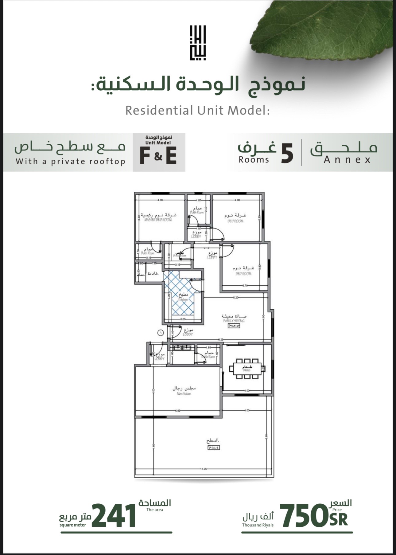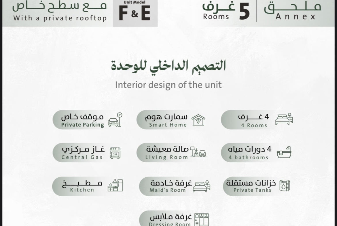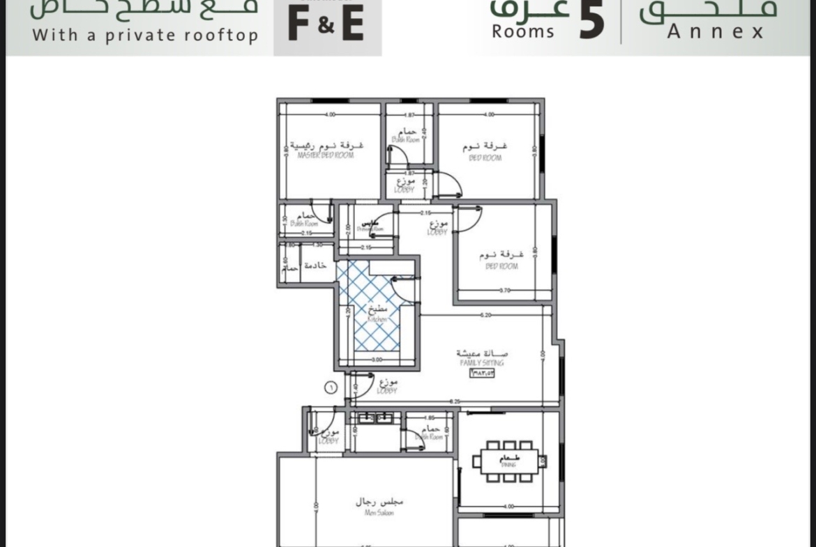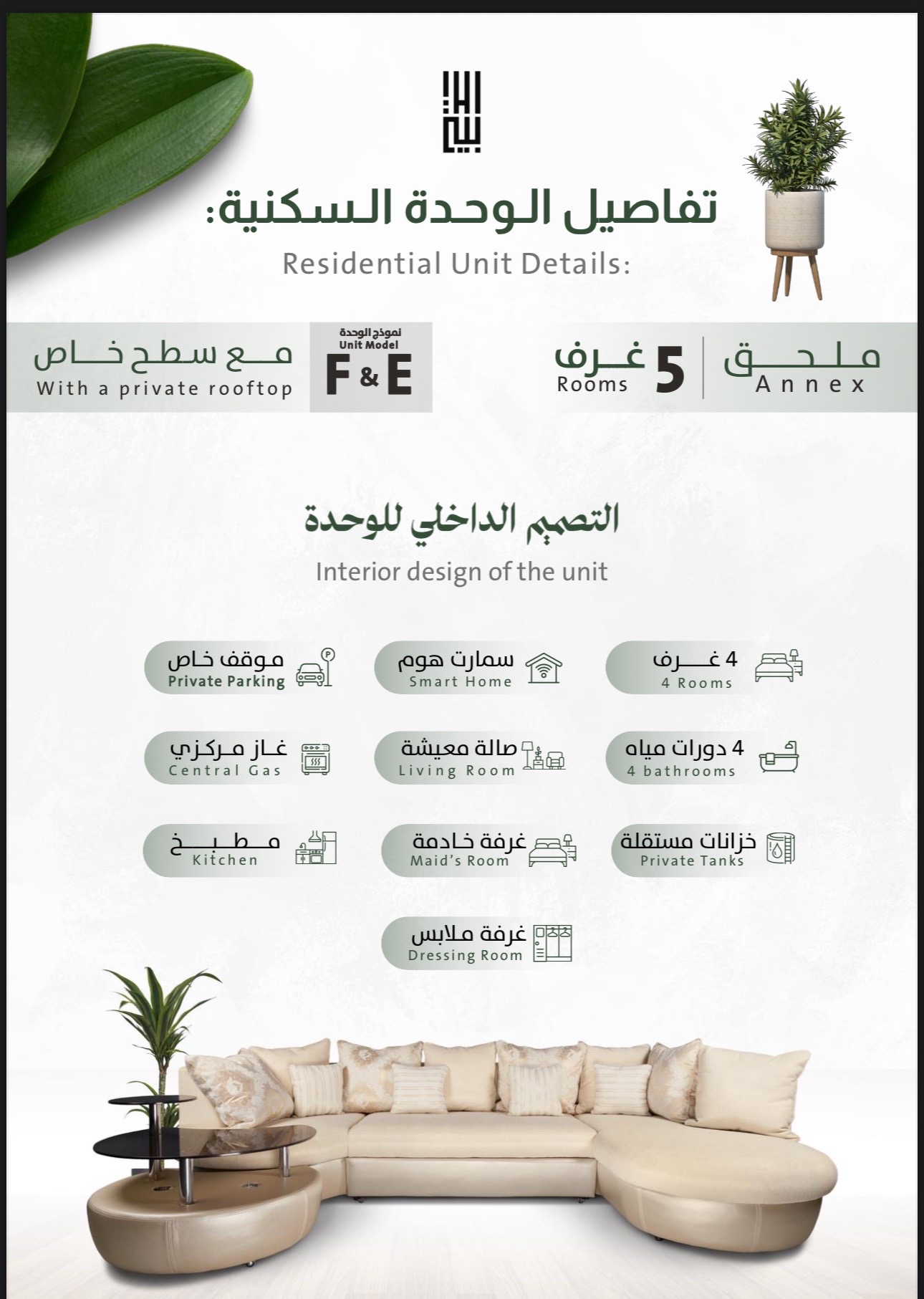5 غرف +غرفة خادمة بحمام مستقل لها + غرفة ملابس