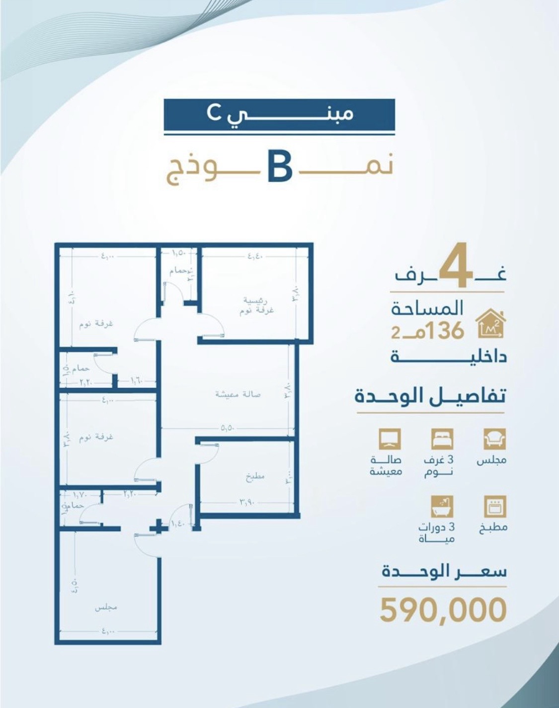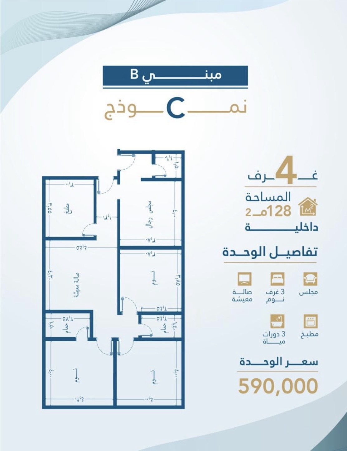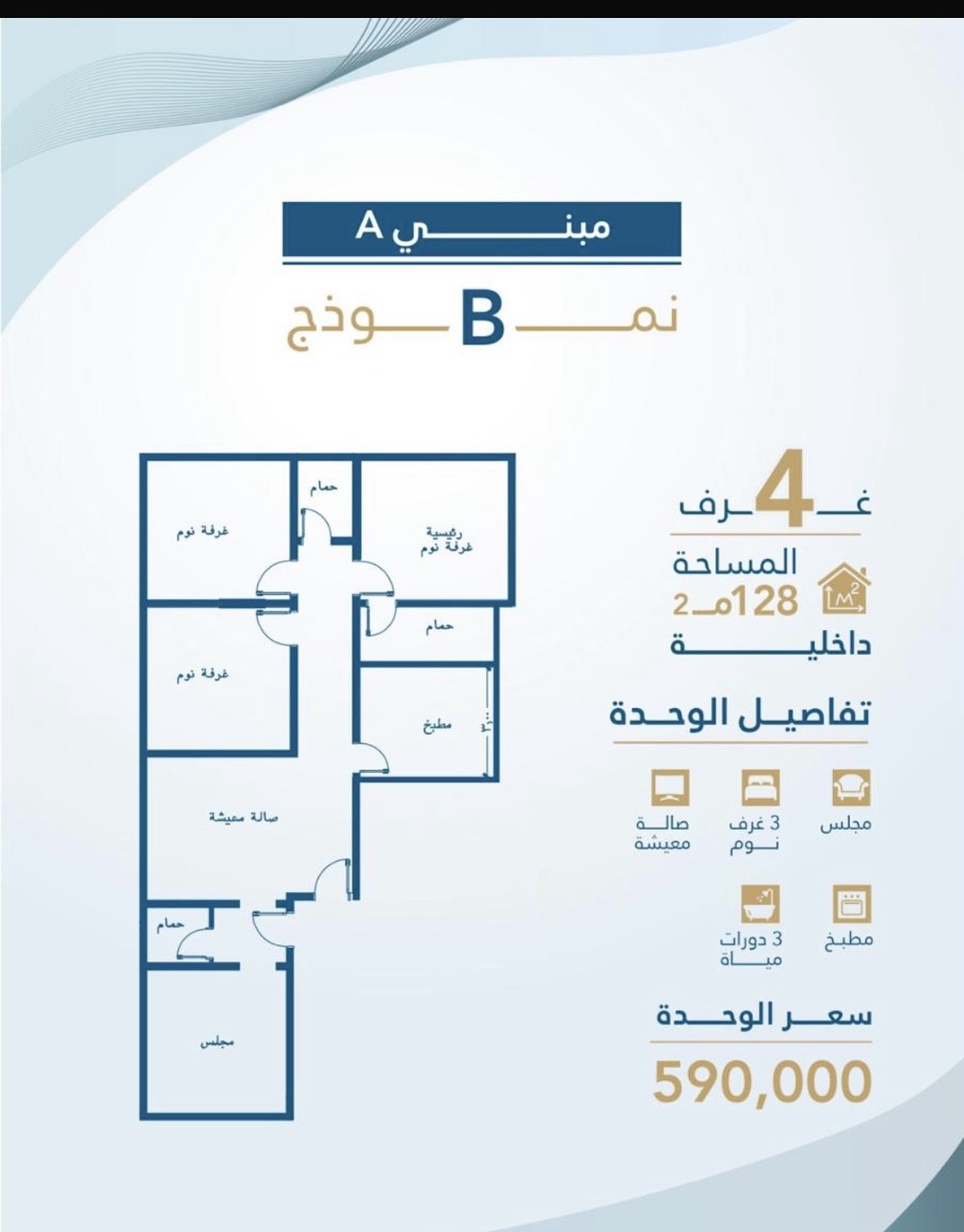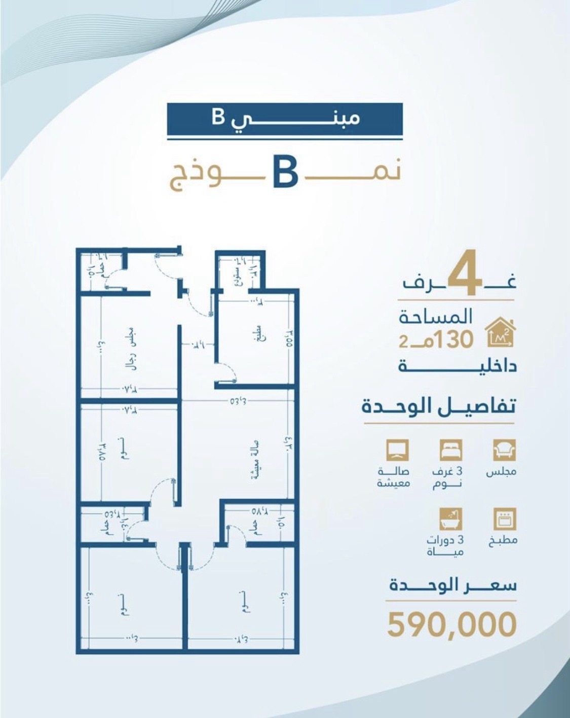 ٤ غرف داخليه مساحة من ١٢٨م إلى ١٣٦ م بسعر ٥٩٠ الف