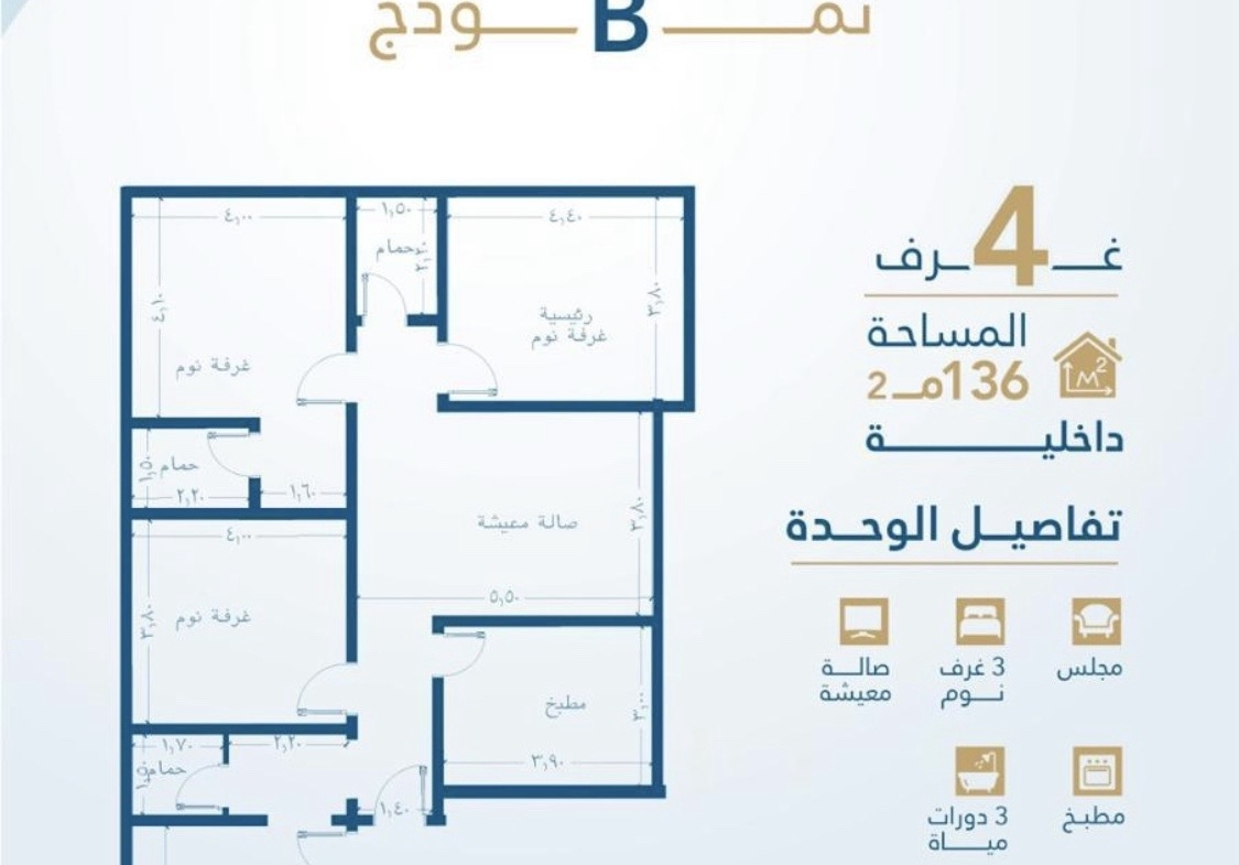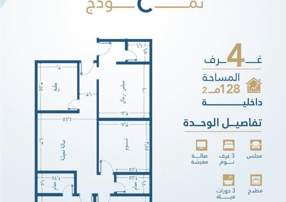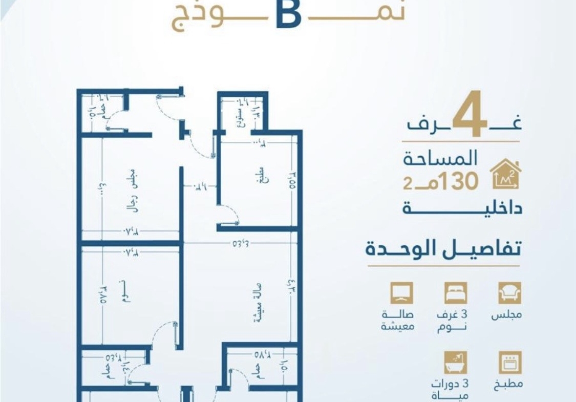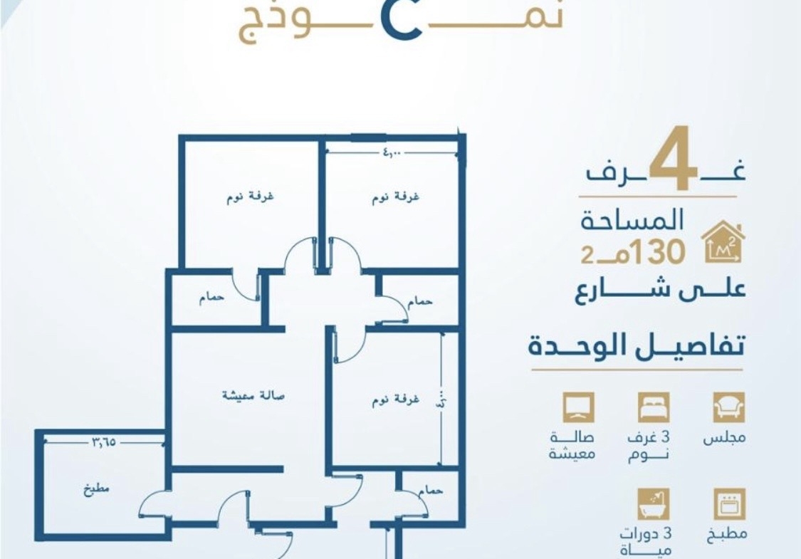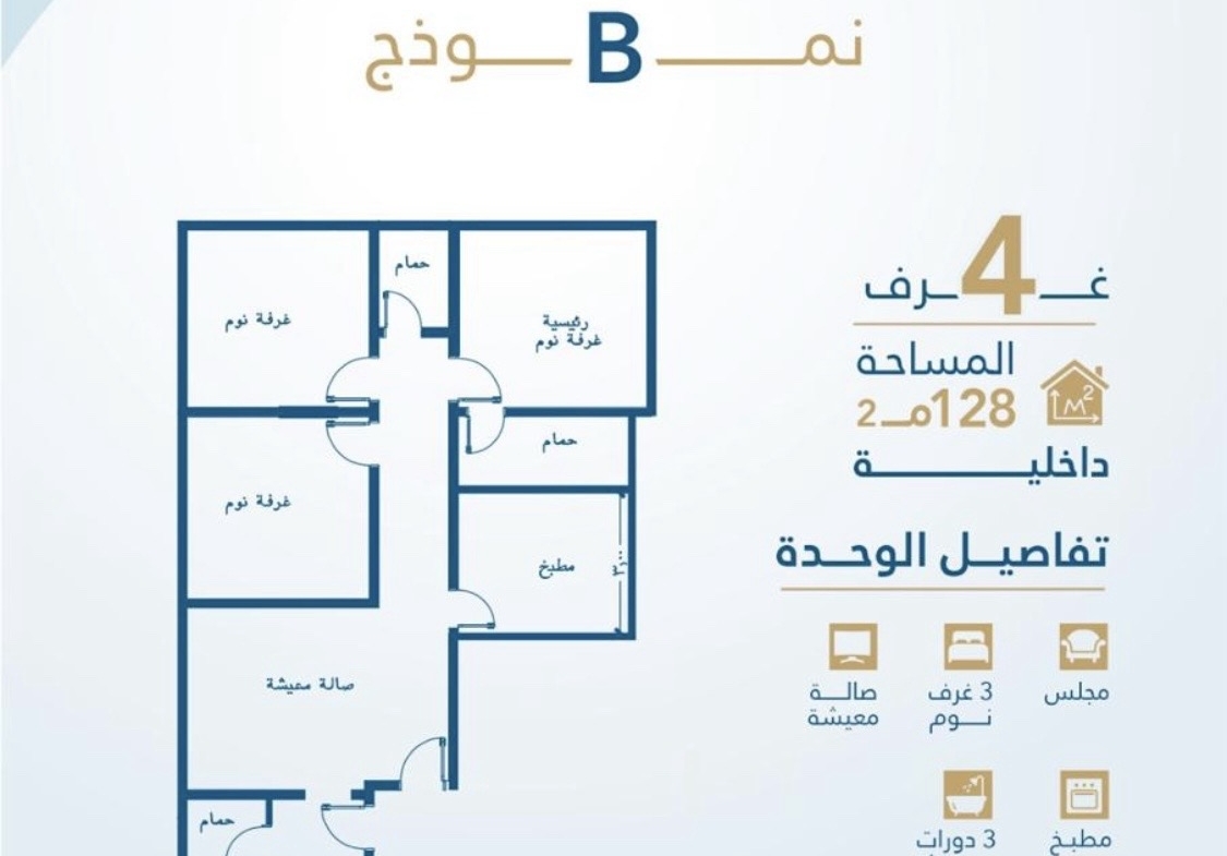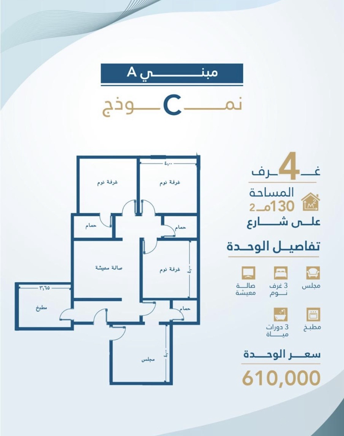 ٤ غرف داخليه مساحة من ١٢٨م إلى ١٣٦ م بسعر ٥٩٠ الف