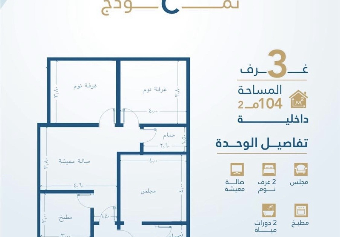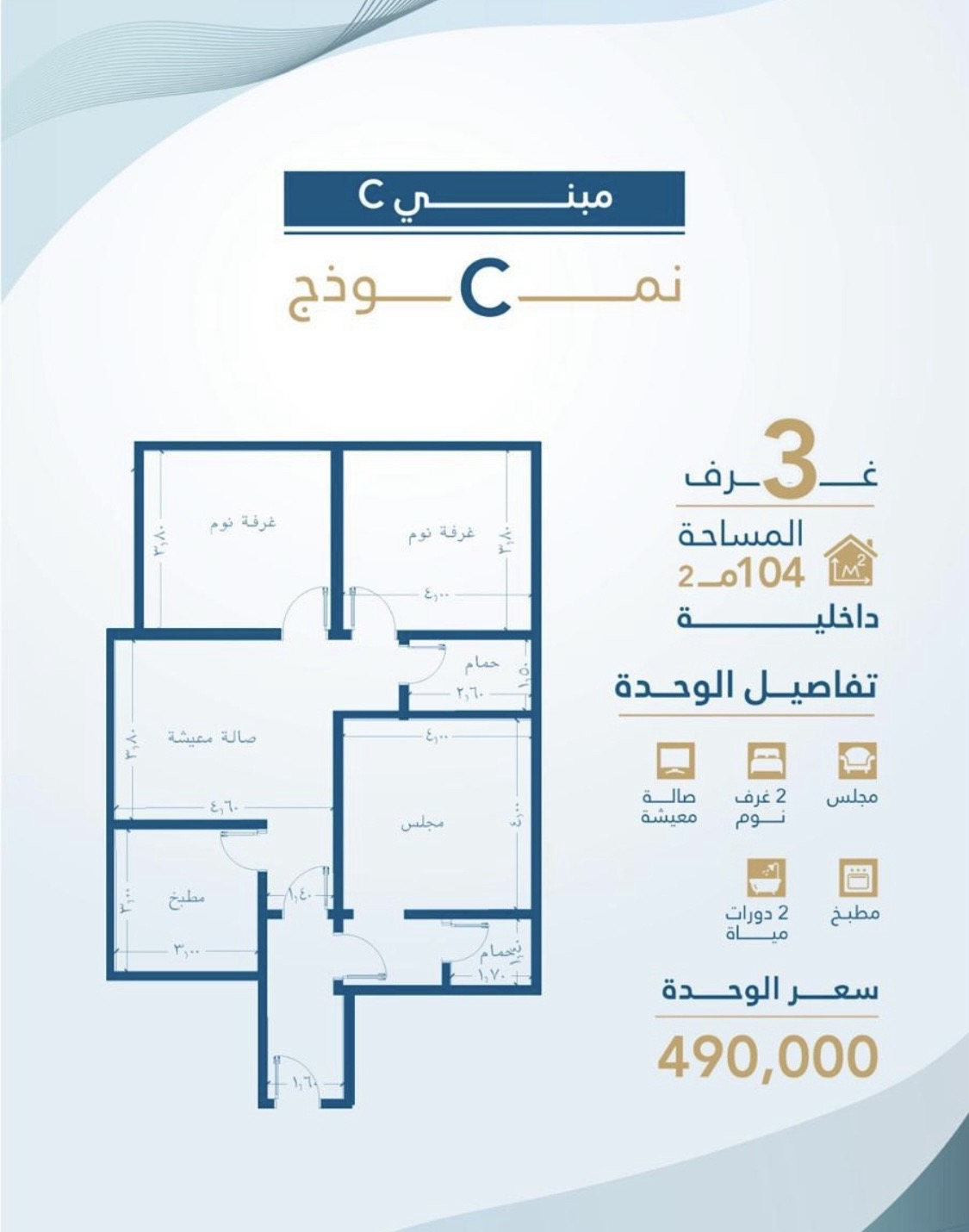 ٣ غرف مساحة ١٠٤ م بسعر ٤٩٠ الف