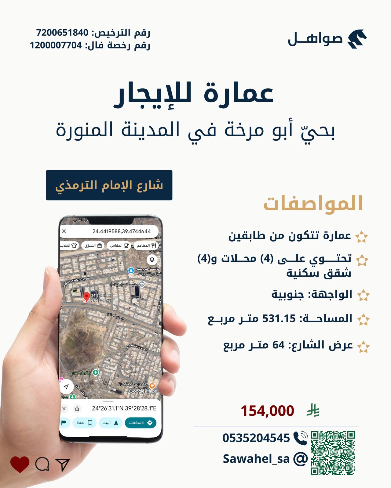 عمارة للإيجار بحي أبو مرخة بمنطقة المدينة المنورة
