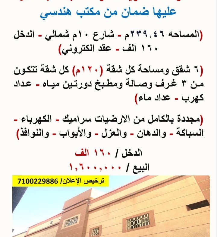 (6 شقق ومساحة كل شقة (120م) كل شقة تتكون من 3 غرف وصالة ومطبخ دورتين مياه – 5 عداد كهرب – عداد ماء)