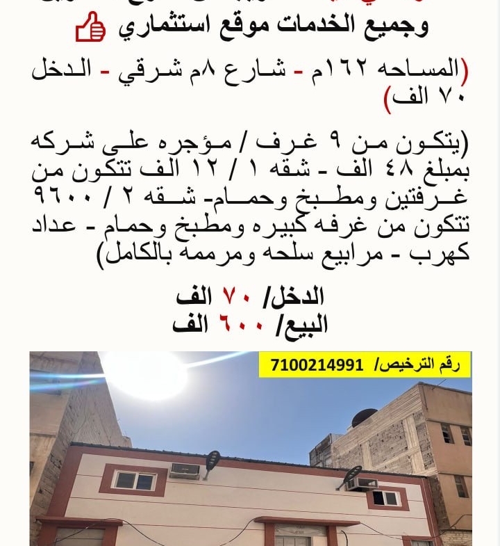 (يتكون من 9 غرف / مؤجره على شركه بمبلغ 48 الف – شقه ١ / 12 الف تتكون من غرفتين ومطبخ وحمام- شقه ٢ / 9600 تتكون من غرفه كبيره ومطبخ وحمام – عداد كهرب)