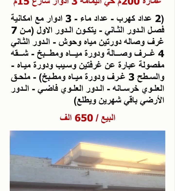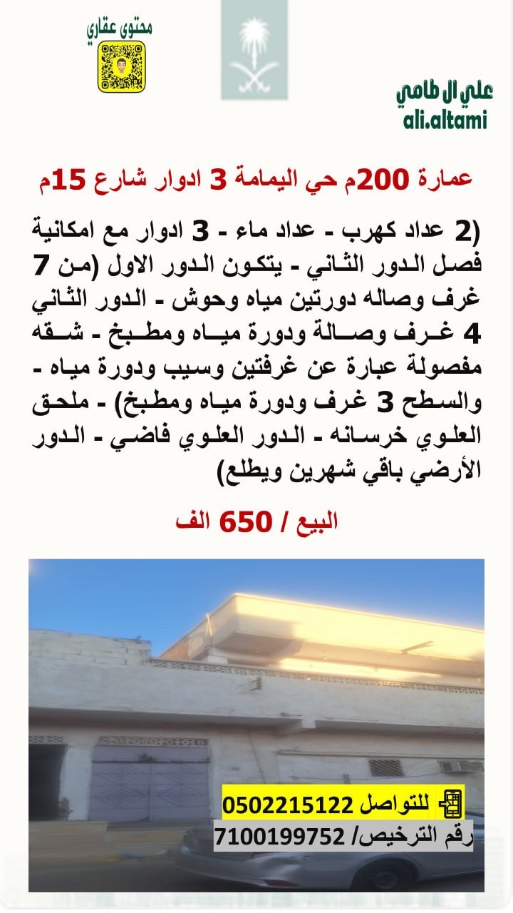 عمارة 200م حي اليمامة 3 ادوار شارع 15م