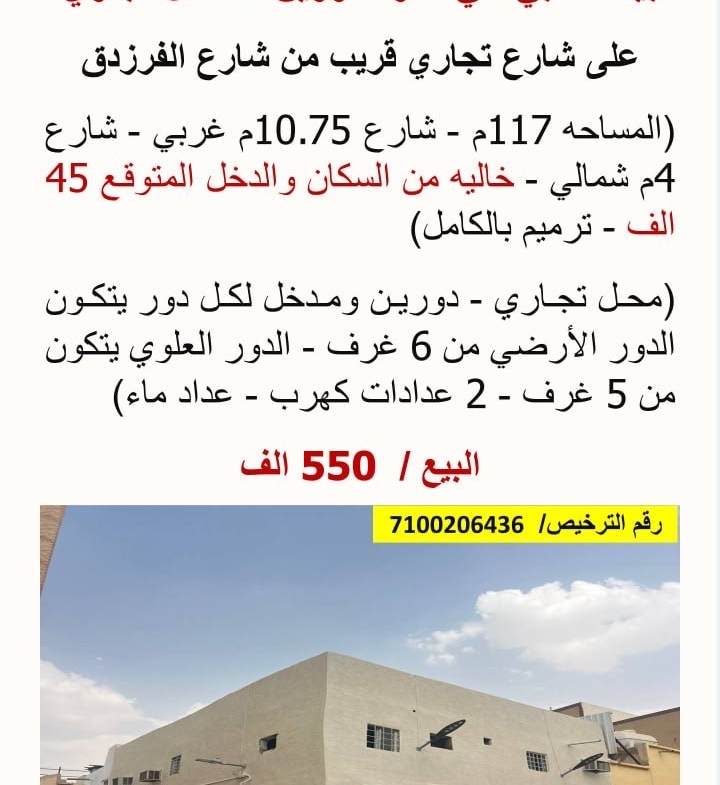 (المساحه 117م – شارع 10.75م غربي – شارع 4م شمالي -الدخل المتوقع 45 الف)
