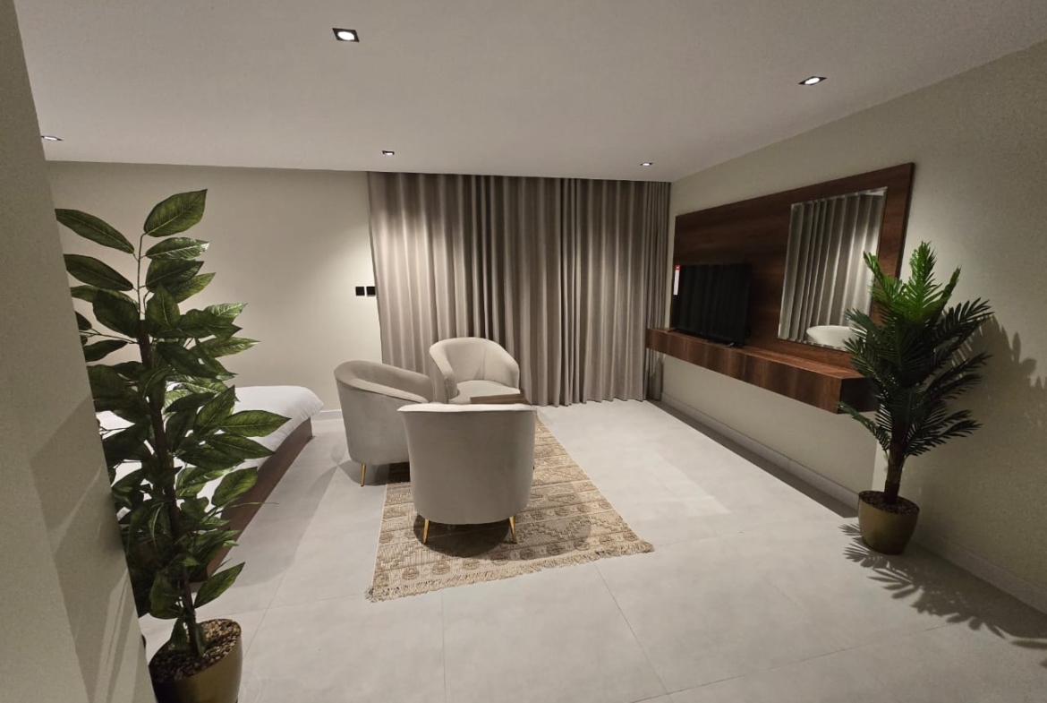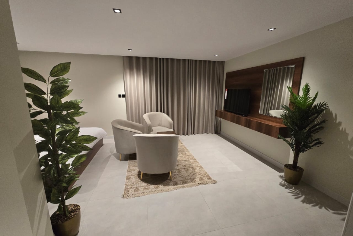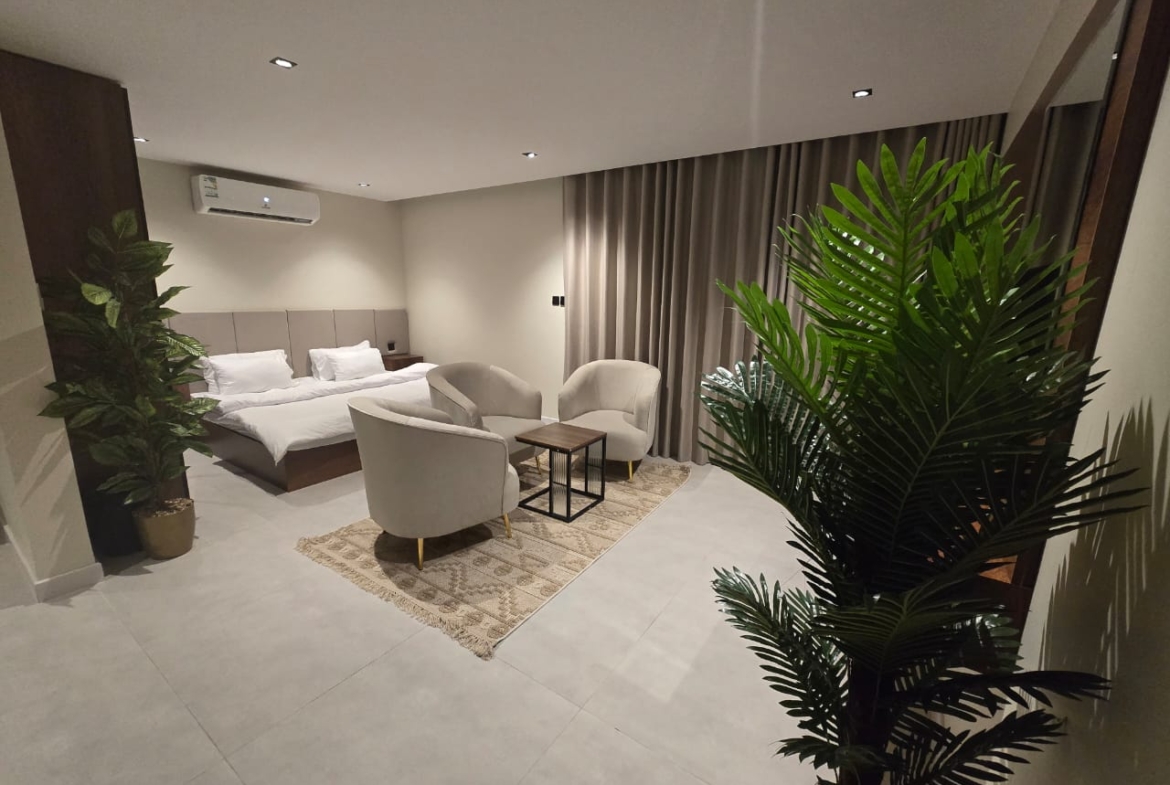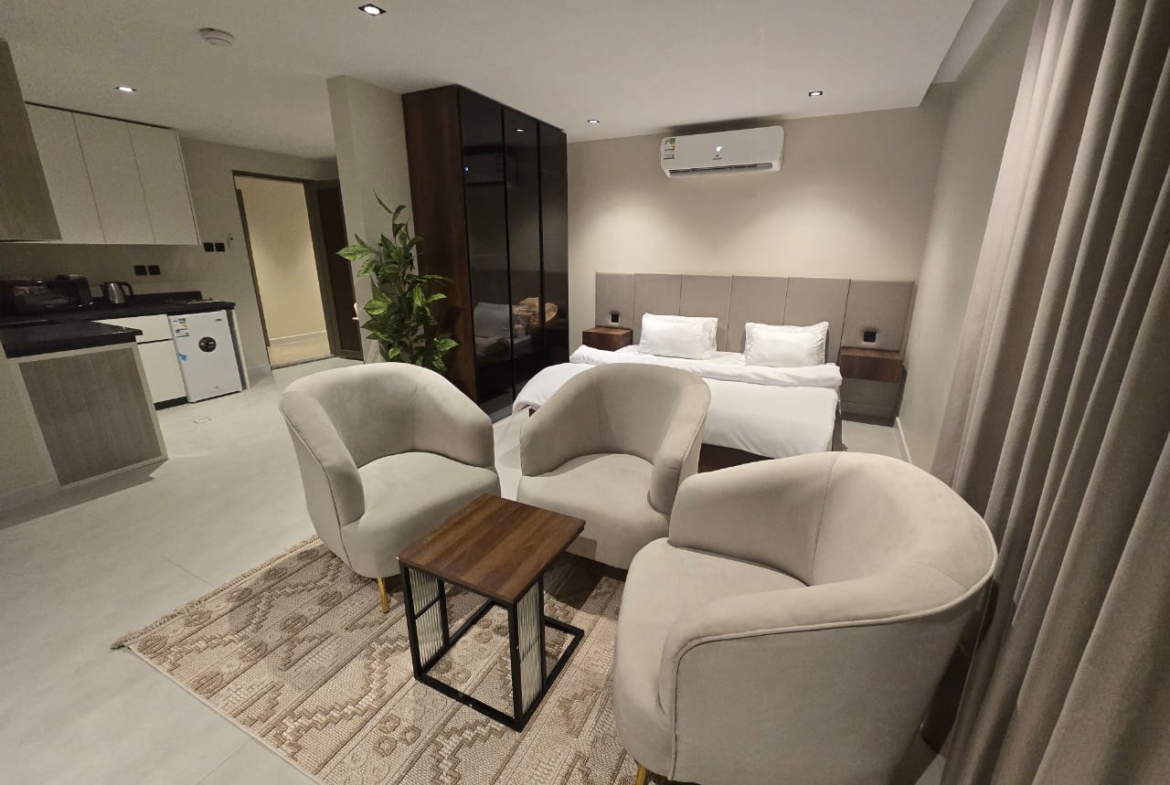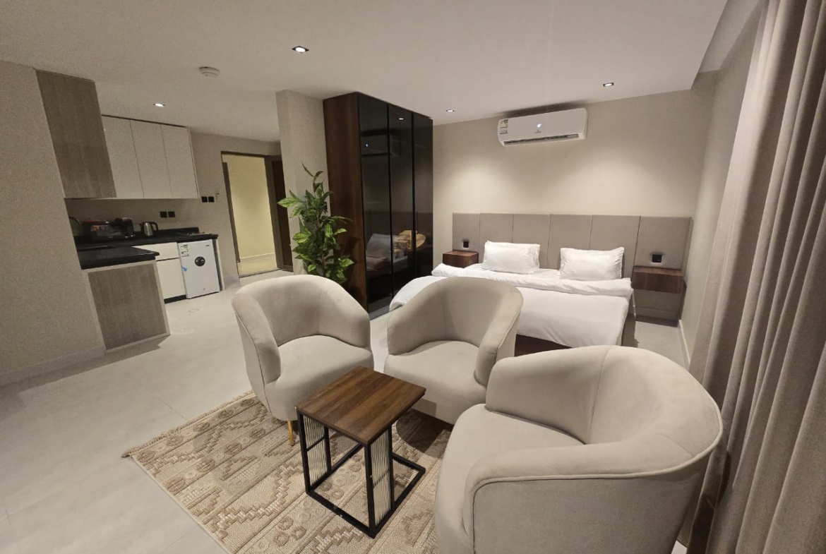 🔸مميزات الغرف :مؤثثه بالكامل بها ( غساله + مطبخ راكب + ثلاجه +شاشه اسمارت + مكيفات اسبيلت )