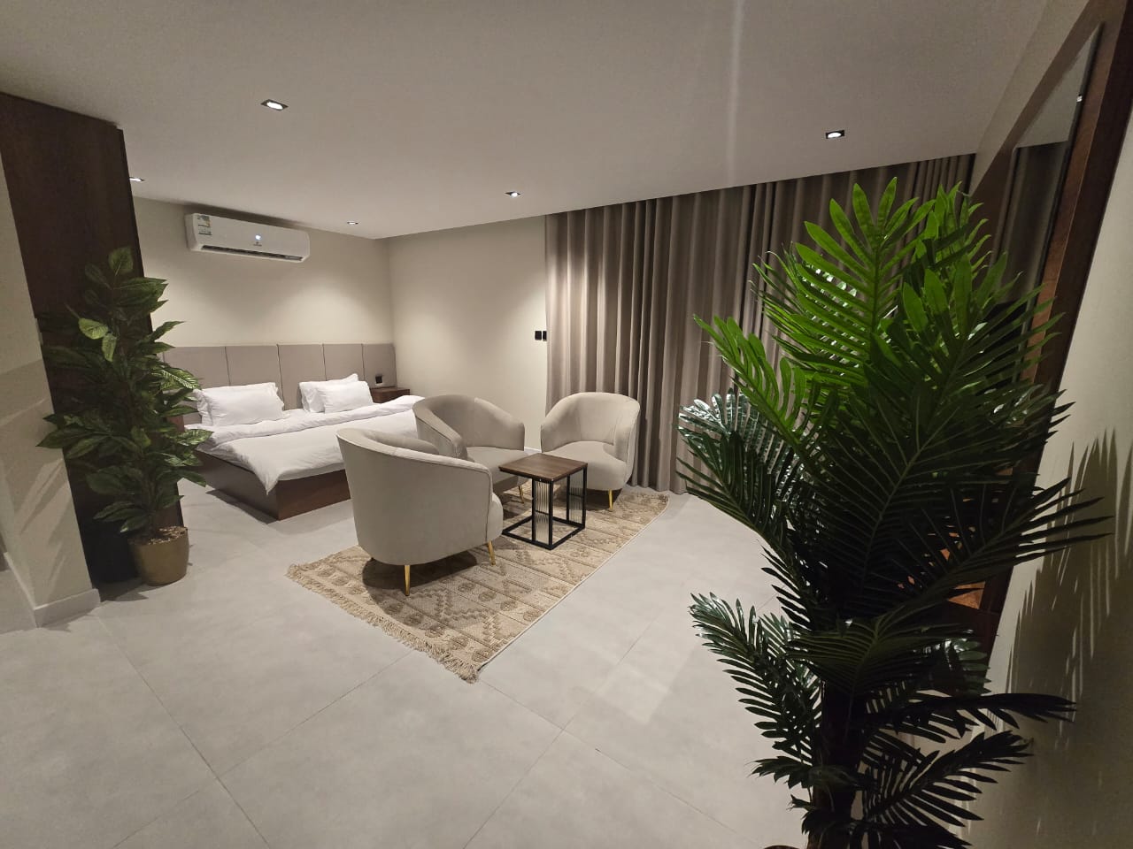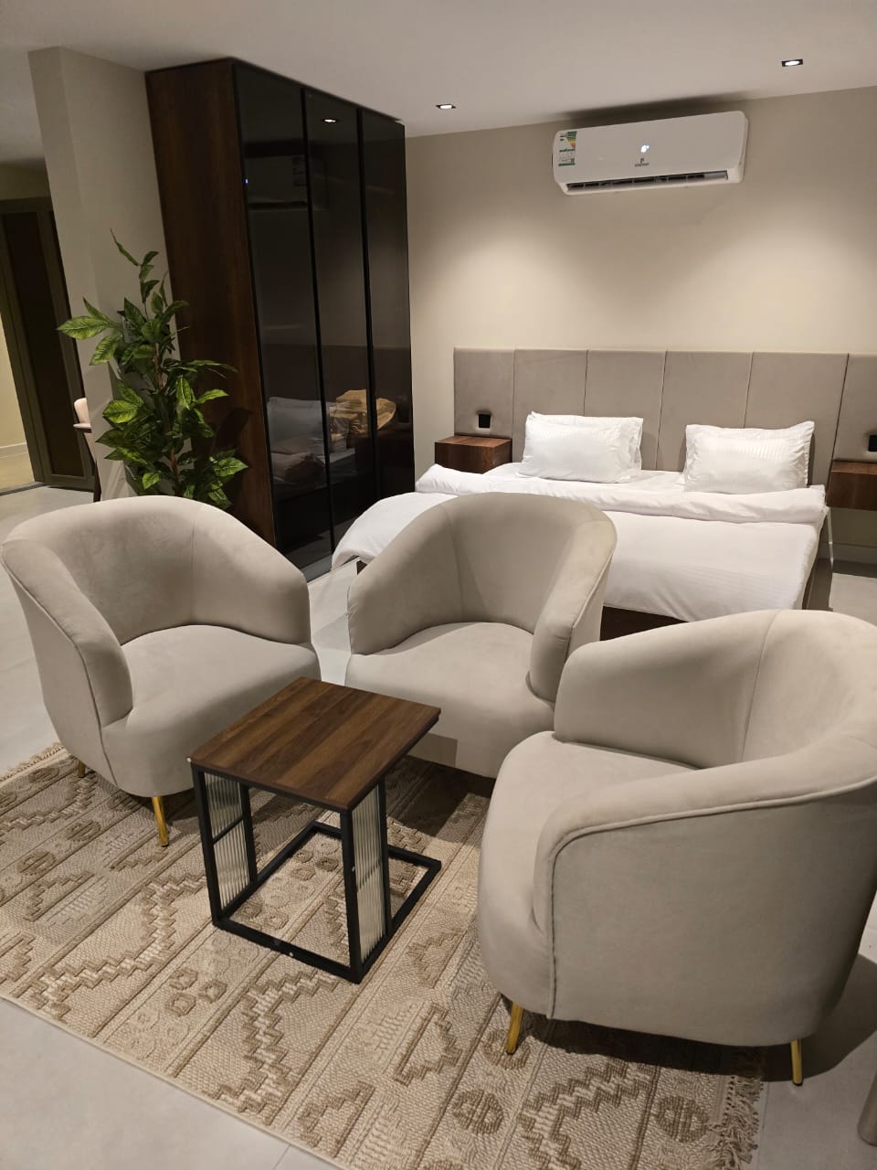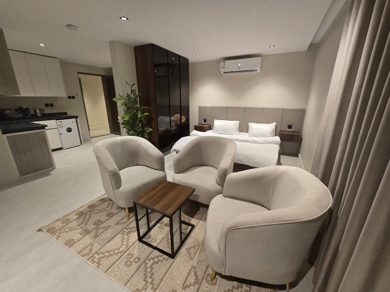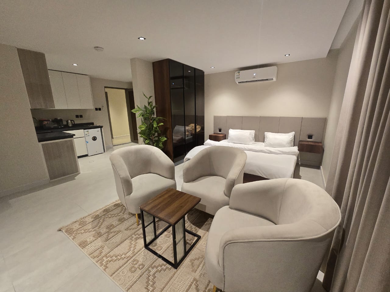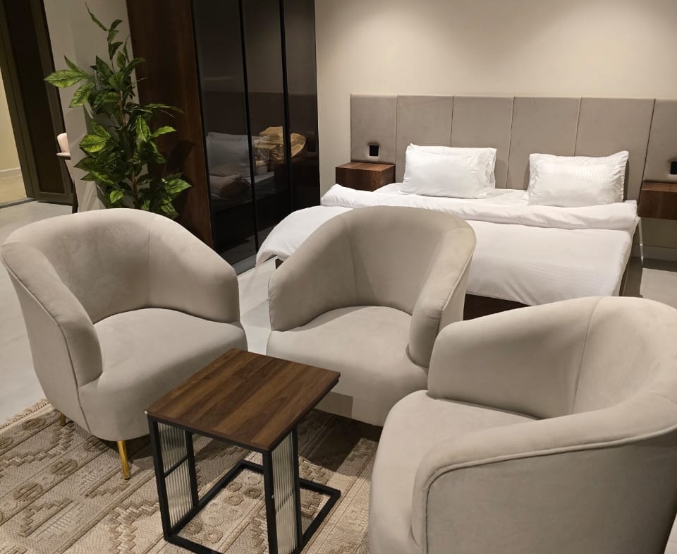 🔸مميزات الغرف :مؤثثه بالكامل بها ( غساله + مطبخ راكب + ثلاجه +شاشه اسمارت + مكيفات اسبيلت )