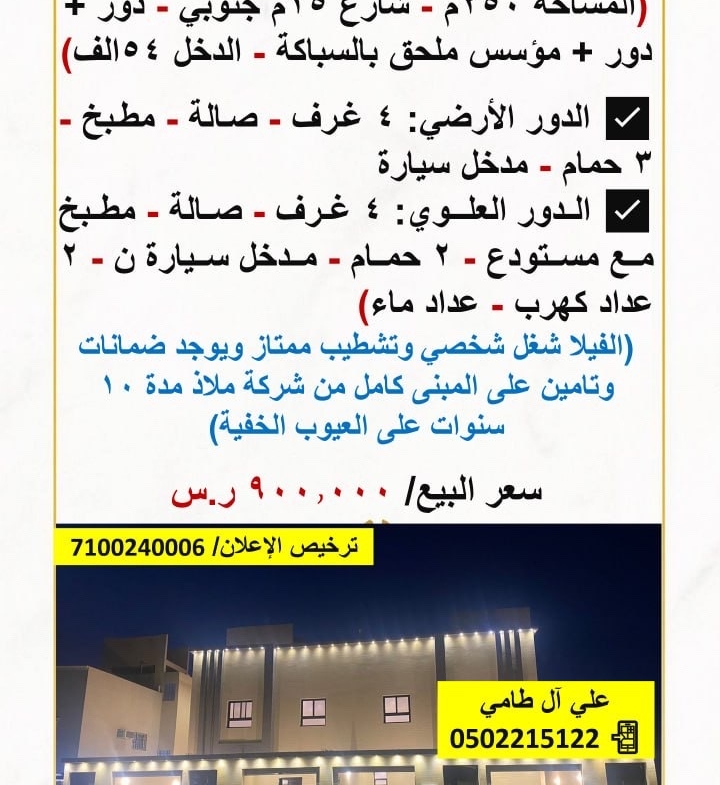 فيلا دوبلكس (دور + دور + مؤسس للملحق مع السباكة)