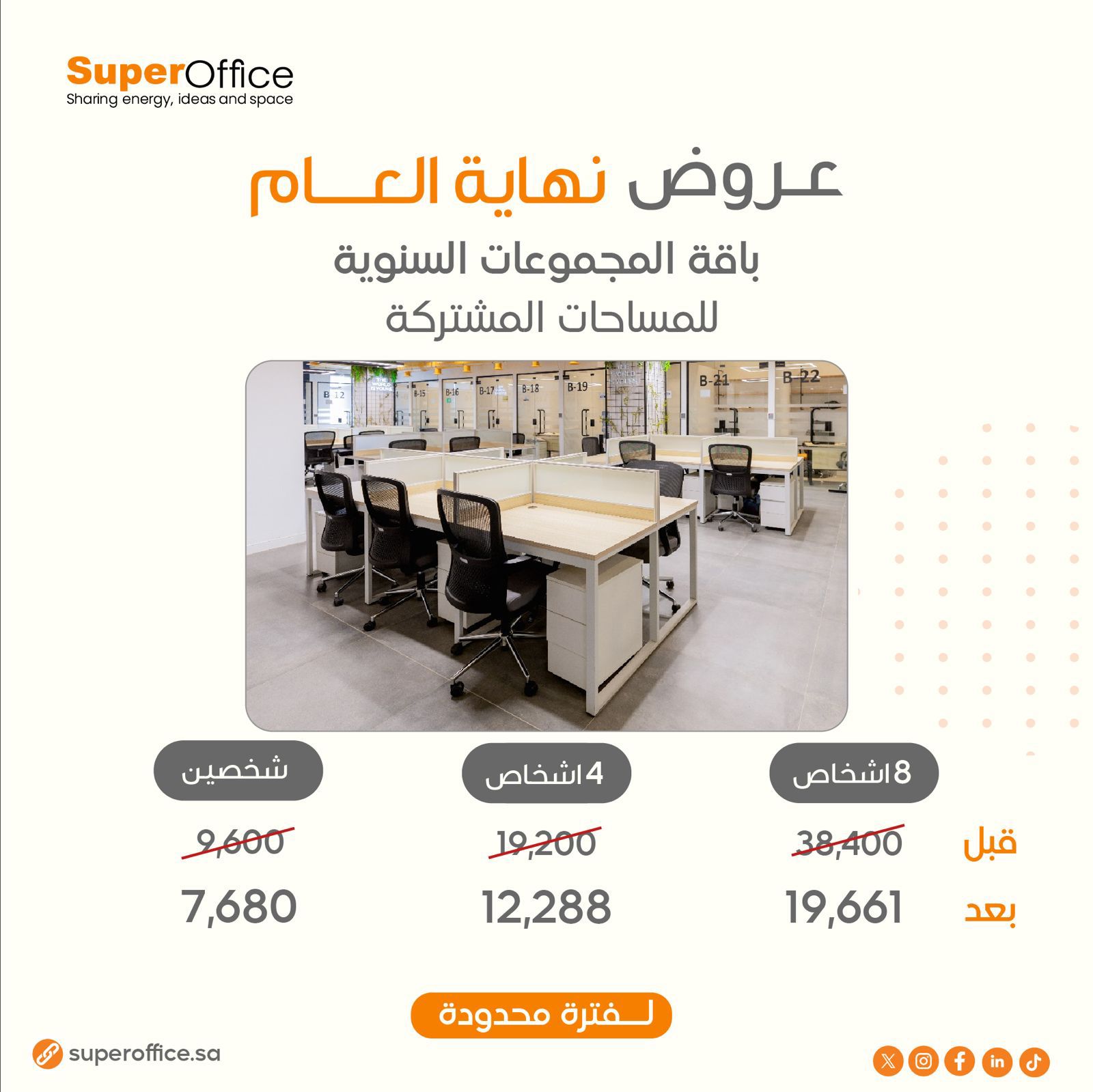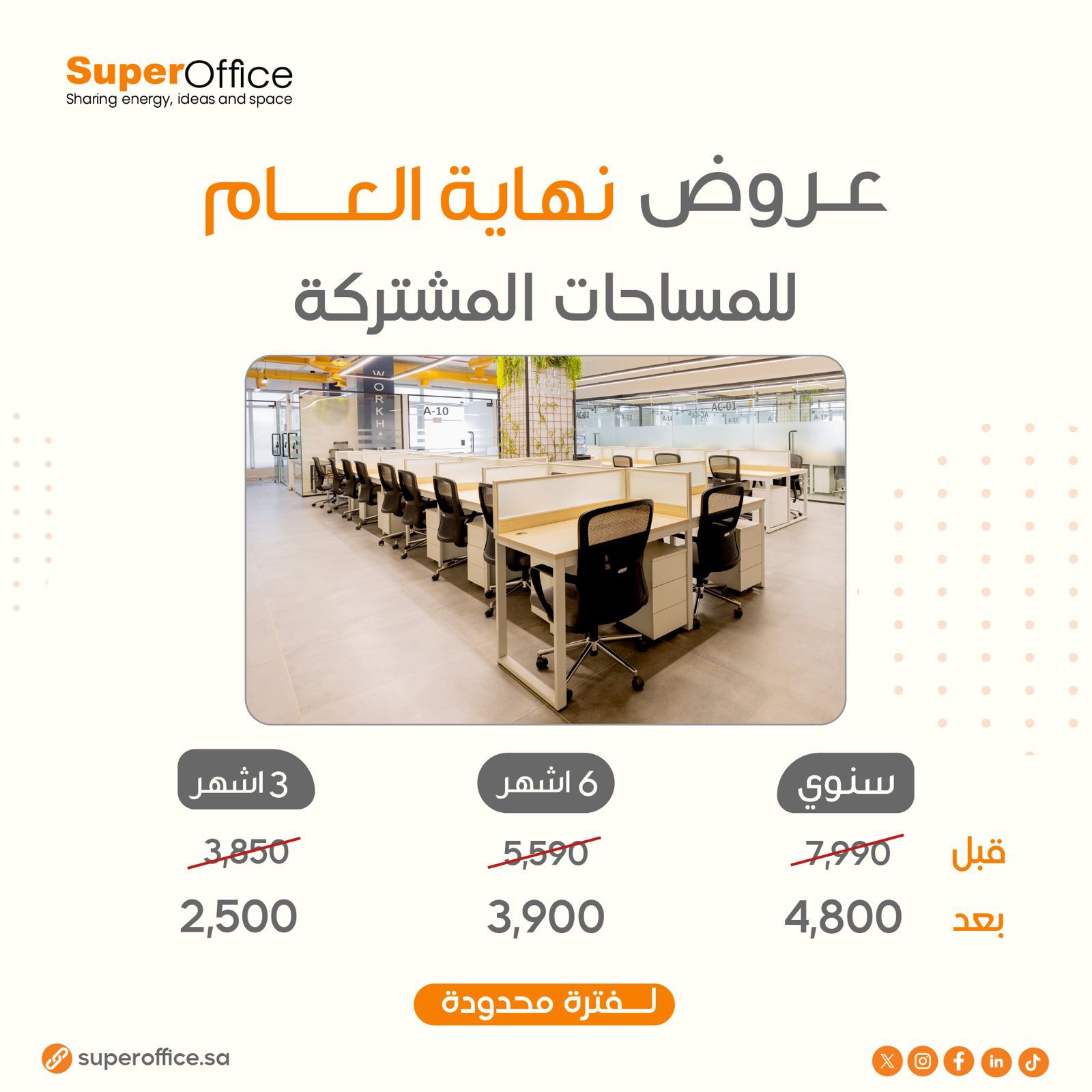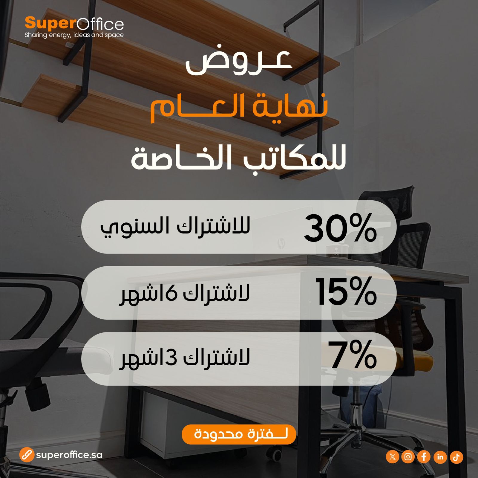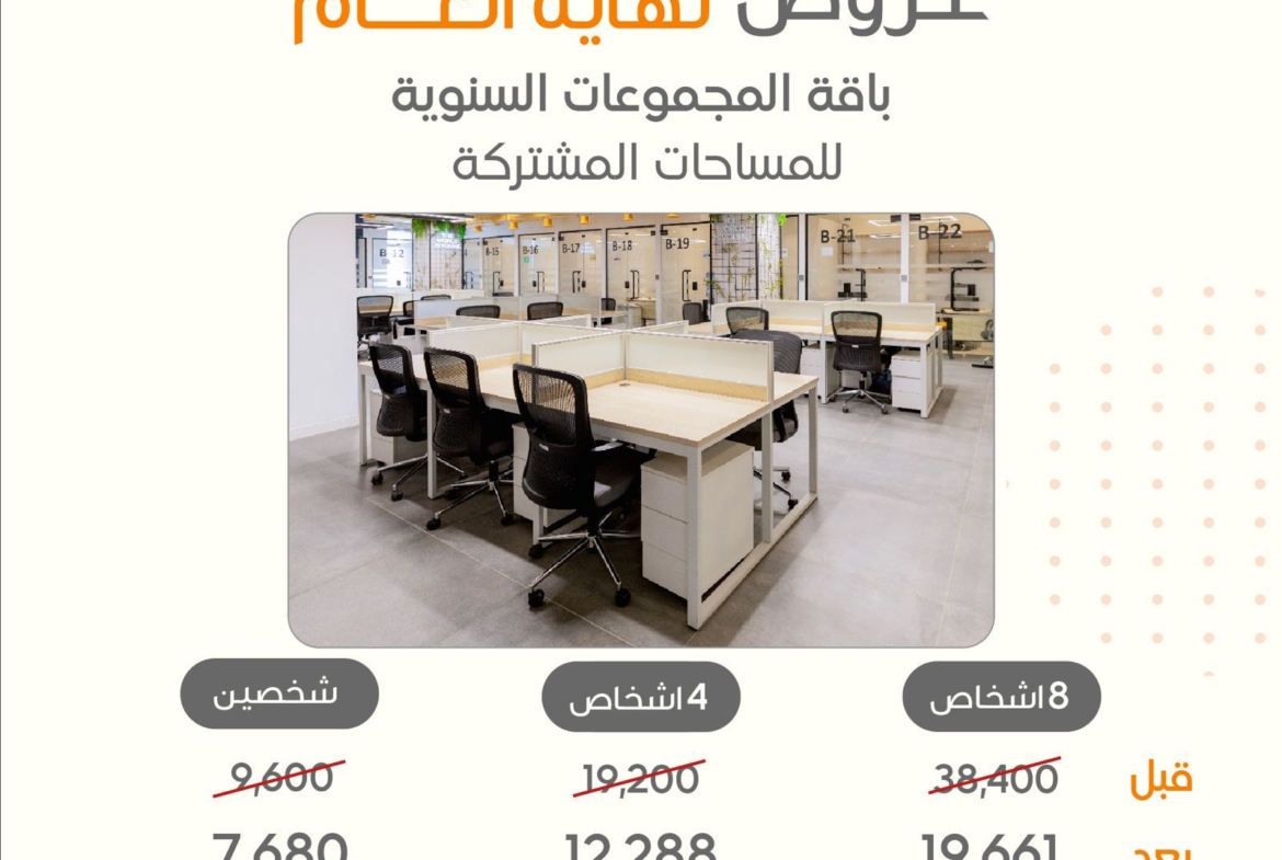 هل تبحث عن مساحة مهنية لعملك؟ تعد هذه المكاتب الحديثة المزودة بأحدث التقنيات وأجود المكاتب والأثاث العصري هي الخيار المثالي. حيث توفر مكاتب شركة سوبر أوفيس مكاتب عصرية تشمل جميع وسائل الراحة الأساسية المطلوبة لبيئة عمل منتجة. الميزات المتوفرة : – مكاتب عصرية متنوعة – الألياف البصرية – الكهرباء – إمداد المياه – الصرف الصحي – الهاتف الثابت – صرف الفيضانات – خدمة الانترنت – طابعات حديثة – أنظمة سلامة حديثة – ظمان للصيانة والنظافة باستمرار – قاعات اجتماعات مجهزة بالكامل – نادي رياضي بالاضافة غرفة مساج – خدمة التي بوي يوجد لدينا عروض تخص الطلاب ( WORK STATION ) مكتب عصري مجهز بكامل التقنيات التي تساعد في عمليات المذاكرة واعداد المشاريع والبحوث شريطة احضار ما يثبت أنه طالب العرض هو : 1. مكتب مجهز ومؤثث بـ( 200 ريال ) في الشهر . 2. مكتب مجهز ومؤثث بـ( 1499ريال ) في السنة شامل الضريبة + شامل التنقل اليومي بين الأفرع بـ( 39 ريال فقط ). أفرعنا / السويدي ( الدريهمية ) – العارض – السليمانية نسعد بزيارتكم ستجدون اكثر مما تتوقعون .